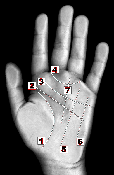 - le mont de Vénus ou anneau de venus (4 sur la photo): il va indiquer la sensibilité qui caractérise la personne.